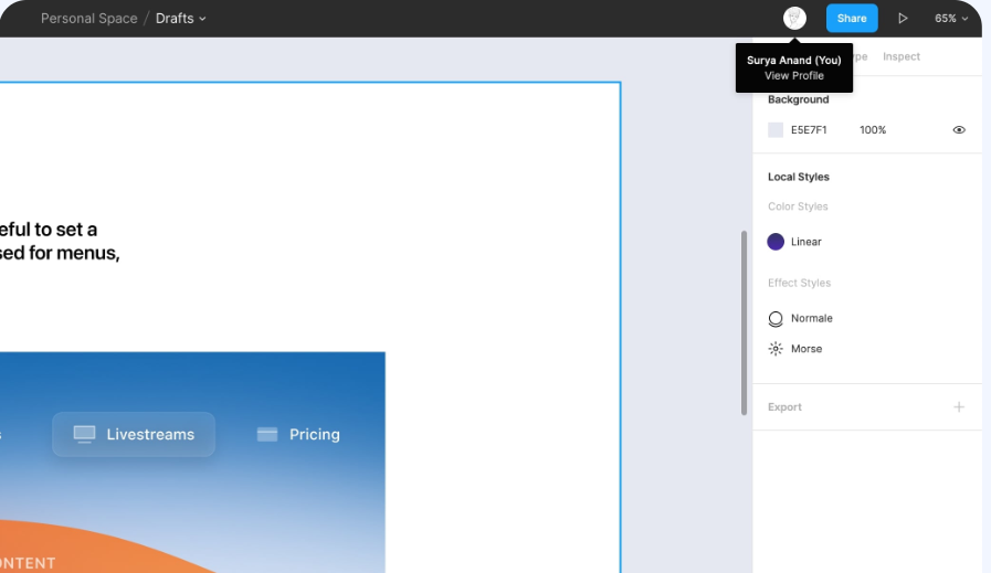 您可以通过右侧的用户个人资料头像轻松查看在给定时间查看文件的人员(请参阅上图)。接下来,您还可以使用共享按钮,它会为您提供嵌入代码或可以共享的链接。它还使您可以访问共享设置。分享按钮旁边是播放按钮,可让您查看您拥有的任何原型。然后,您还有缩放选项。缩放设置还为您提供其他选项,如网格、轮廓、标尺等。