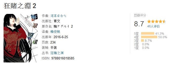 豆瓣的评分也能佐证这点:《狂赌之渊》漫画、动画的评分,从未低于过8分。