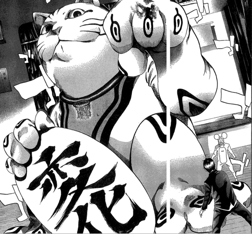 这个招财猫一出场就用左臂开始拍人,把人像臭虫一样拍死。
