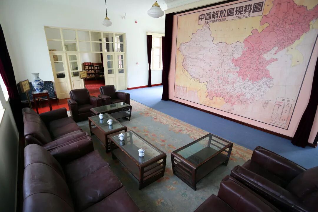 会客厅的西侧是卧室,一张宽大的木板床占据了多半间屋子。中间是会客厅,在会客厅的墙上张挂着巨幅《中国解放区现势图》,是1949年2月中国人民解放军总部制印的。