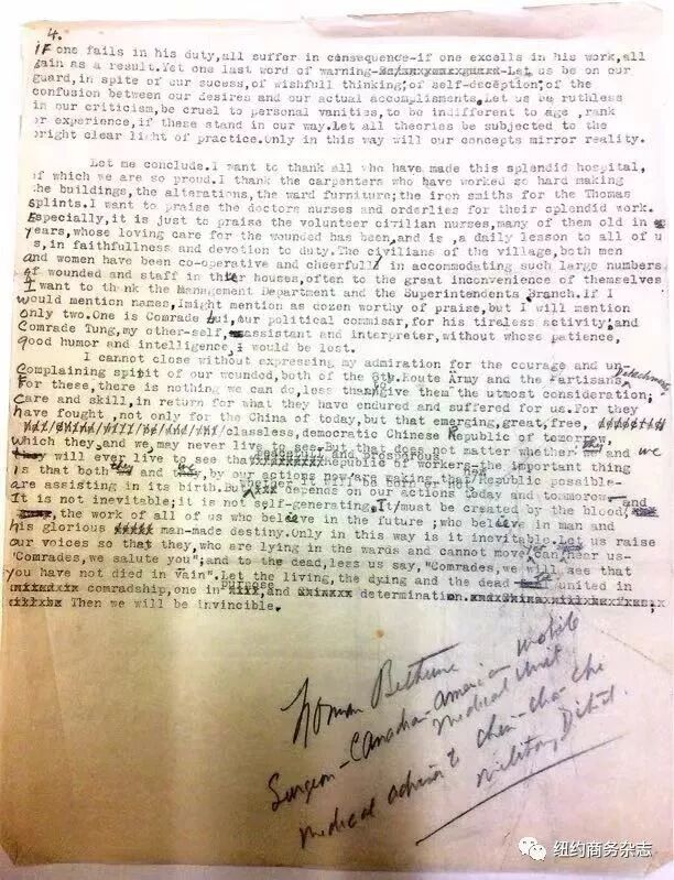仅就我所能见到保留至今白求恩签名的亲笔信,就已经够得上大量。此外,我又从加拿大和其他各地搜求了战时白求恩致毛泽东的书信,其数量和内容都是惊人的。至于白求恩信中向毛泽东写了些什么,我将另文介绍。而翻译这些信和史料,是个大工程,也将是对这一段难忘之尘封历史的可贵挖掘。 此外,在审读这批中共领袖的抗战文献时,我们发现毛泽东跟周恩来、朱德、彭德怀等都向纽约国际援华总部写信谈及白求恩和为晋察冀军民服务的事迹。这也是这方面史料的重要延伸线索。 除了给毛泽东的亲笔信,白求恩生前和逝世后还通过其他方式向美国和加拿大友人寄送了很多文件和珍贵的影视资料。可惜的是这些资料有的当年毁于战火、有的因战时困难的邮递状况下在万里辗转中没能全部保存。更可惜的是,他寄回美-加亲朋的材料又有一部分毁于麦卡锡主义政治迫害。据白求恩的妹妹告知,因为当年可怖的政治高压,她不得不烧毁了在她家留存哥哥信件和遗物的皮箱。而我们此次发现的这一部分珍贵史料因白求恩直接寄到了当年纽约国际援华总部、其后它们被文件直接持有人捐献给大学档案部门秘藏没受到政治干扰,所以幸存了下来;它们应该是世存孤本,其资料价值无可估量、弥足珍贵。 在今天这个纪念白求恩的日子里,我们不应该忘记白求恩,我们也不会忘记白求恩。当年在中华民族遭受危难时刻,这位用他整个生命和热血去反抗日本法西斯、救助中国人并献身中国的英雄,我相信,每个正直善良的中国人心中,都会为他恒久地供奉着一瓣心香。(作者:海龙;来源:纽约商务杂志)
