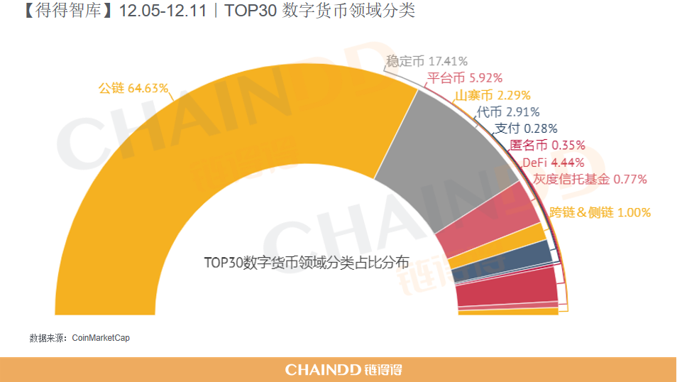 其中占比最多的领域是公链,占比为64.63%,排名第二的领域是稳定币,占比为17.41%。TOP 30数字货币领域分类的占比分布如下图所示: