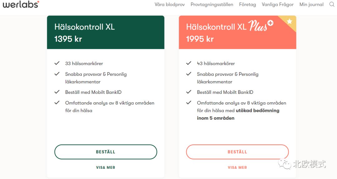 但这几年瑞典比较流行的是网上购买血检。网上的血检服务主要以方便见长,而且花和去私人医生体检那里同样的价格,可以获得全面细致很多的检查。客户(必须是有瑞典人口号的成年人)可以自己网上选择体检套餐付款之后自行选择合适的时间去任意一家合作的采血机构抽血。私人血检公司的存在允许客户直接跳过排队见医生这一关,直接自己决定自己想要查什么。检验结果出来之后医生一般会在几天内给你出一份详细的解读报告(不过是瑞典语的)。