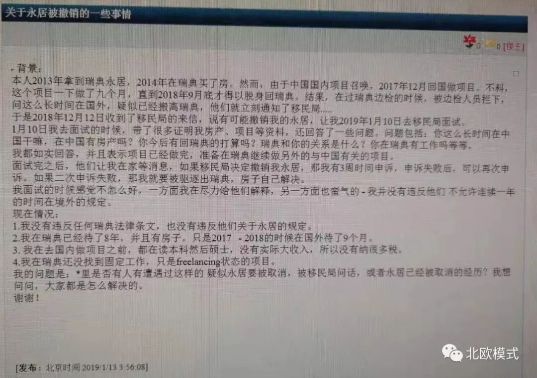 但近期,某瑞典华人与留学生论坛有人现身说法,表示自己只离开瑞典在国内呆了9个月,就被移民局调查并取消了永居,而且上诉到移民法庭都没用。一时间华人圈流言四起,人心惶惶。