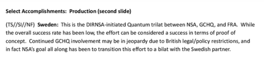 斯诺登公布的另一份文件还显示,在2013年的时候,美国的NSA,英国的GCHQ和瑞典的FRA在一起组成了一个叫Quantum的联盟,来进行情报共享。但是英国因为自己国内法律的限制,参与度不高。美国表示希望把这个三方合作的项目变成美国和瑞典双方的合作。
