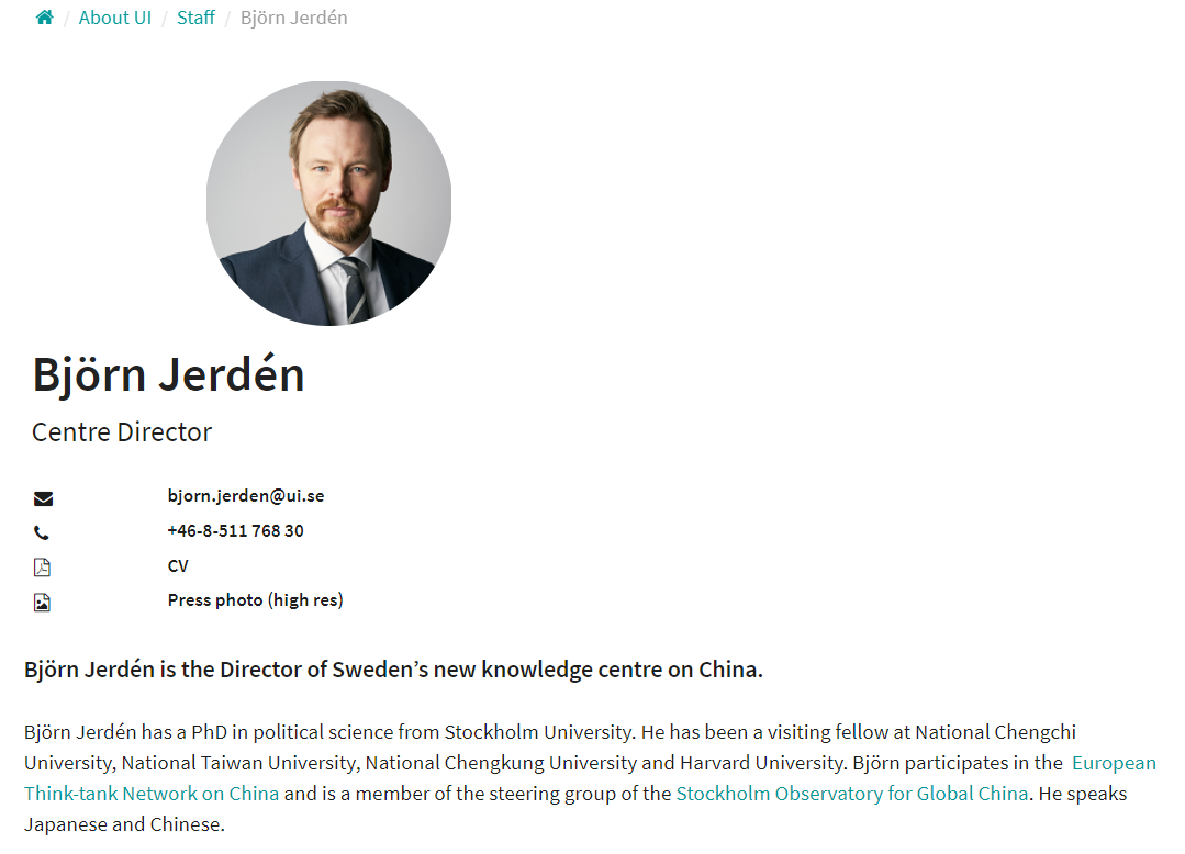 进一步搜索发现叶必扬的瑞典语名字是Björn Jerdén,1981年生,在35岁博士还没有毕业的时候就已经是瑞典外交研究院亚洲研究项目的负责人了,并且最近刚成为新成立的专门研究中国的部门的负责人。和很多其他汉学家一样,他有一名中国夫人,是比他自己小10岁的2013年的台湾小姐选美冠军,可以算是一名年轻有为的人生赢家。