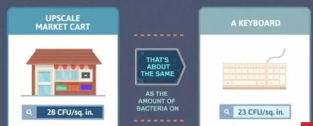 高档超市(如:Whole foods、Trader Joe’s)手推车细菌数(28),和电脑键盘细菌数(23)几乎一样!