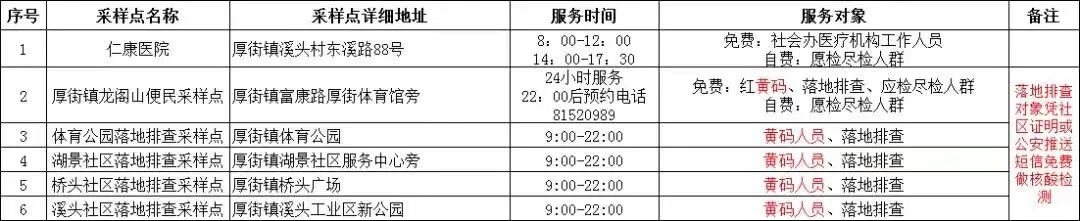 请黄码人员到厚街镇龙阁山便民采样点(24小时服务)、体育公园落地排查采样点、湖景社区落地排查采样点、桥头社区落地排查采样点和溪头社区落地排查采样点检测。