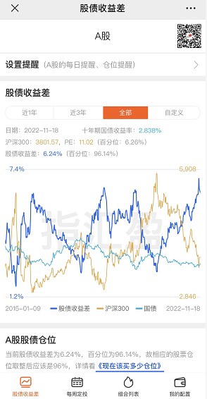 意味着整体市场的性价比要比96.14%的时候要高,股票的性价比较高。关于股债收益差详情用法,查看《股债收益差工具上线了》
