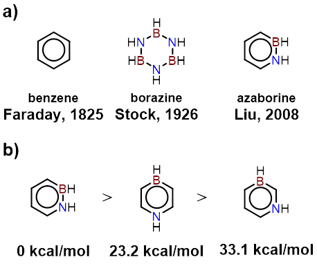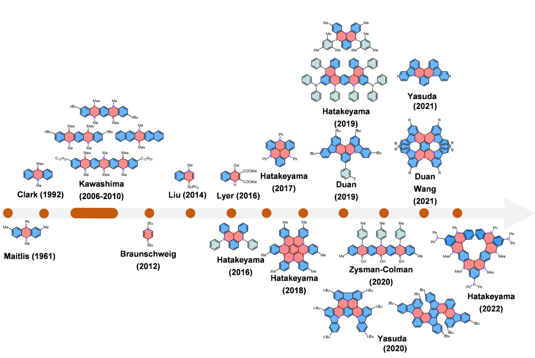 1926年,Stock和Pohland等人发现了由硼氮原子交替形成的六元环分子borazine,它也被称为“无机苯”。这一发现进一步激发了人们对部分BN掺杂的苯环(azaborine)及稠环芳烃的研究兴趣。BN单元和CC单元具有相同的价层电子数,但在π电子分布上却有着极大的差异。因此,在共轭骨架中引入BN单元能够有效地调控分子的电子结构与光电性能。根据硼氮原子的相对位置,azaborine可分为三种异构体:1,2-azaborine、1,3-azaborine和1,4-azaborine。到目前为止,1,2-azaborine及其衍生物已被广泛研究,以1,2-azaborine为结构基础的稠环共轭分子已在有机光电功能器件中获得广泛的应用;而1,3-azaborine因其较差的稳定性在合成上依旧存在很大的挑战。尽管1,4-azaborine与1,3-azaborine相比具有更高的稳定性,但其在过去的几十年里也并未被广泛研究。直到2016年,Hatakeyama等人首次证明了以1,4-azaborine为结构基础的多重共振热激活延迟荧光(MR-TADF)材料在有机发光二极管(OLED)中的优异性质(如高外量子效率和高色纯度等优点),1,4-硼氮芳烃才逐渐引起了人们广泛的研究兴趣。