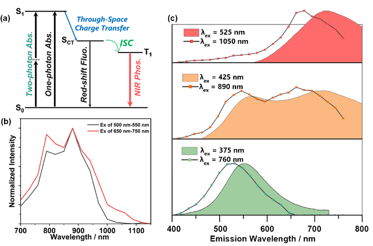 图3:(a)超分子组装体近红外激发和发射机制的可能机理示意图。(b) 双光子激发光谱。(c)单/双光子激发的稳态光谱。