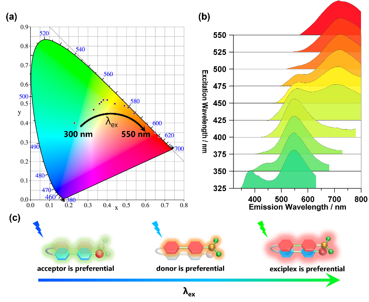 图2:(a)不同激发波长下组装体发光的CIE图。(b) 不同激发波长下组装体发光的稳态光谱。(c)依赖激发的发光的可能机制。