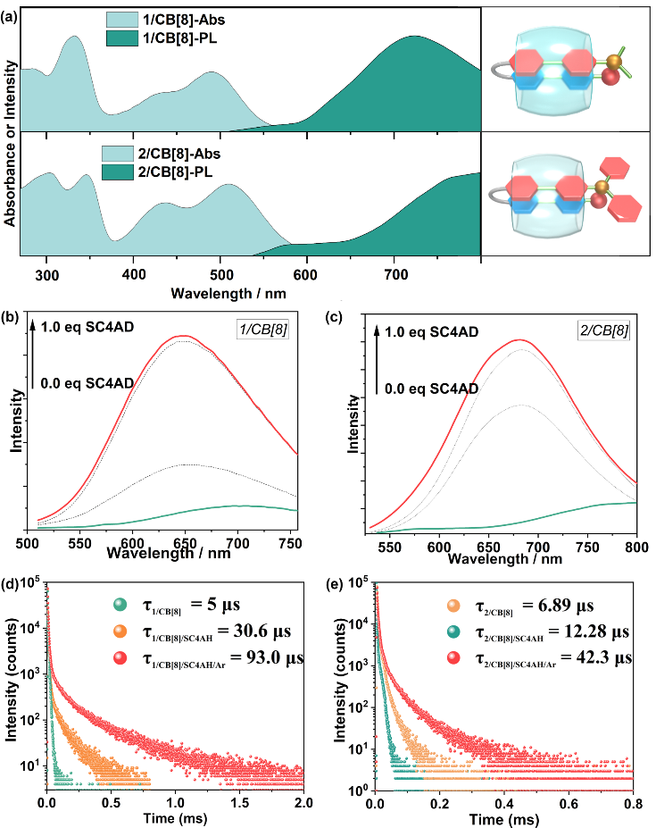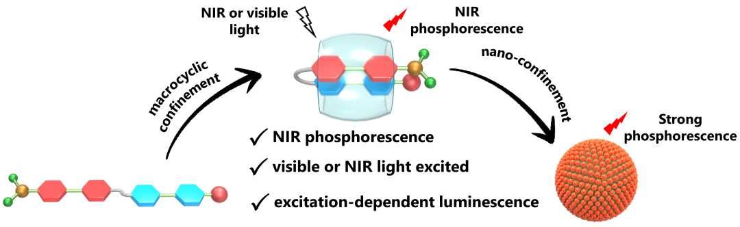 创新点:近日,南开大学刘育课题组提出了“大环限域和纳米限域”的策略,即通过两级超分子限域组装去诱导增强客体分子近红外激发和发射的有机室温磷光。此外,超分子组装体在不同的激发波长下可发射可见光到近红外区域的颜色可调的发光。