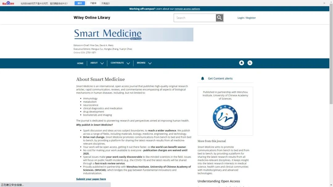 近日,由国科温州研究院主办与Wiley共同出版的全英文医学综合性开放获取期刊Smart Medicine正式开放投稿,创刊号预计10月正式发布。