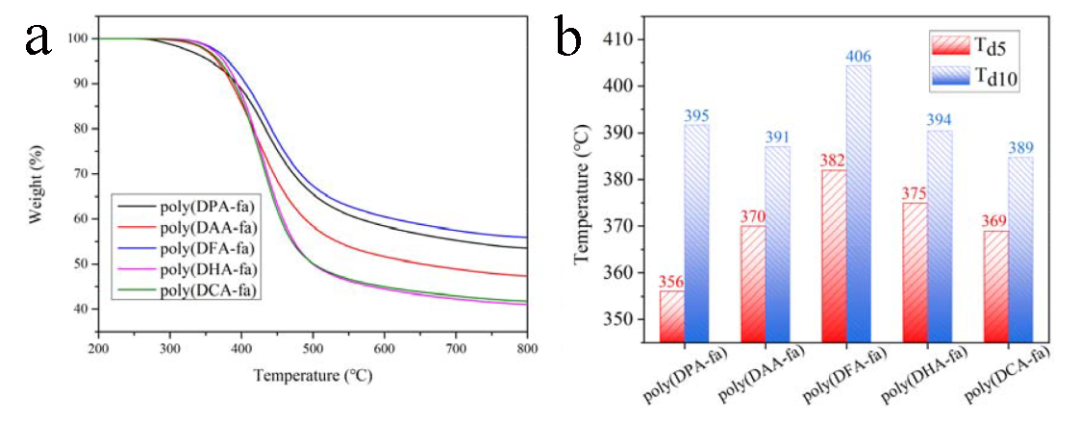 图1 聚苯并噁嗪树脂的玻璃化转变温度(a), poly(DHDA-fa)与其他高性能苯并噁嗪树脂Tg和 Td5%值的综合比较(b)