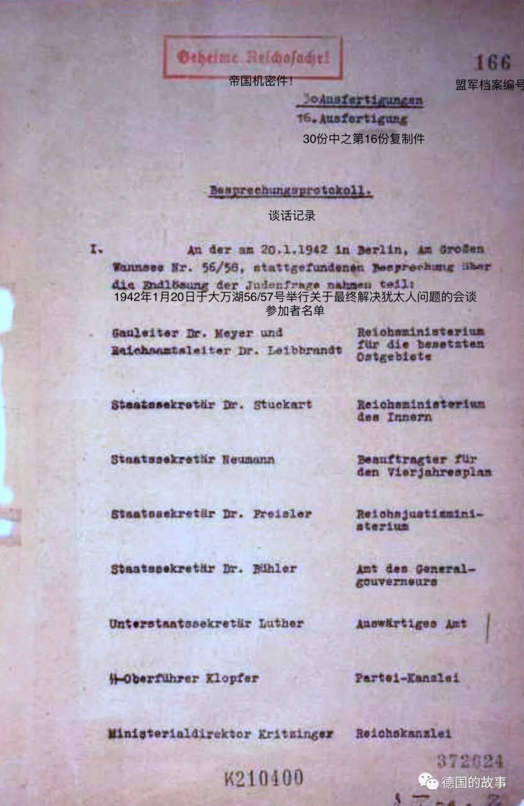本文只是简述与会的15/16人是如何卷入以及他们各自的下场,若要了解他们在会议上的表现和言论可自行点击本文末链接的《万湖会议》。与会者中如海德里希,艾希曼等人的情况已经在本号不同的文章里都有较详细的介绍,本文中因此从简。