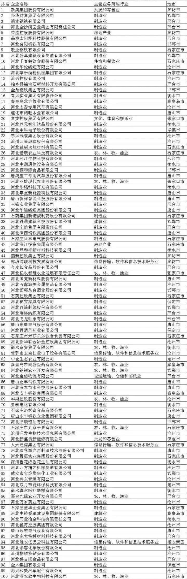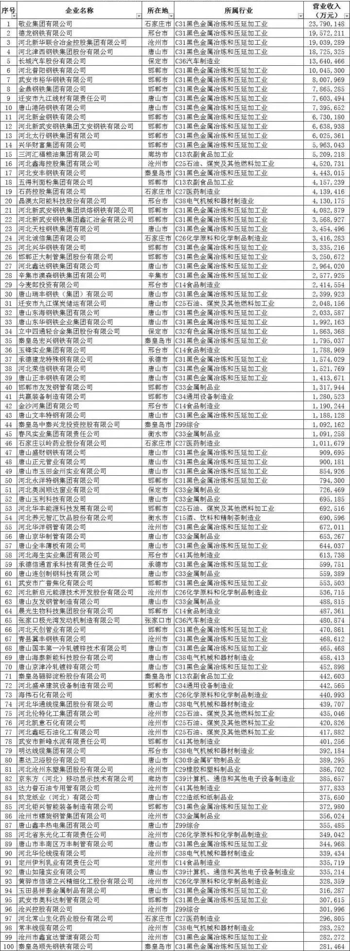 2022河北省制造业民营企业100强名单