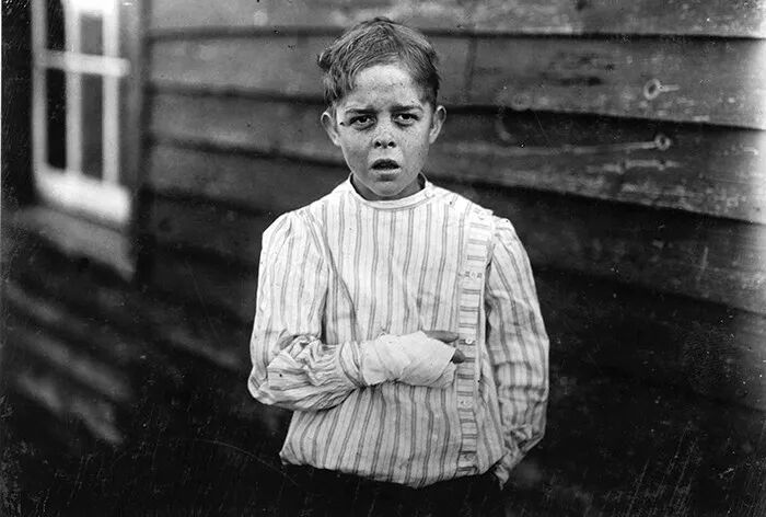 照片拍摄于 1912 年 10 月,当时贾尔斯·埃德蒙·纽森(Giles Edmund Newsom) 11 岁,和他的弟弟都在北卡罗莱纳州贝塞默市桑德斯纺织厂工作。直到某天,一台机器掉在他脚上,砸碎了他的脚趾,他摔倒在纺纱机上,纺纱机又压碎了他的两个手指。