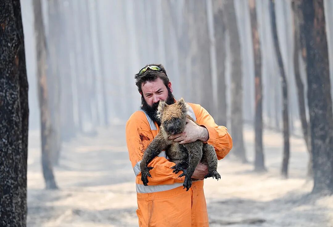 △当地时间1月7日,澳大利亚袋鼠岛附近,野生动物救援人员进入燃烧的森林,救出受伤的考拉。摄影师:David Mariuz