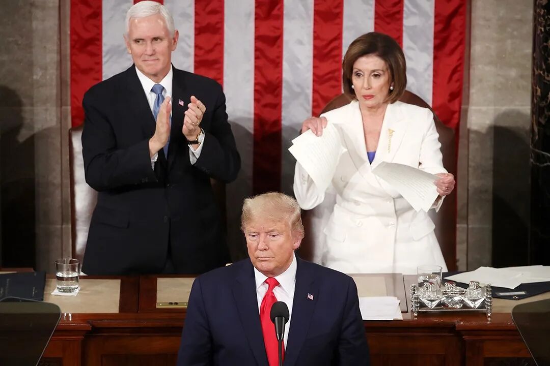 △当地时间2月4日,美国华盛顿特区,特朗普结束国情咨文演讲后,众议院议长南希·佩洛西将演讲稿撕成两半。摄影师:Mark Wilson