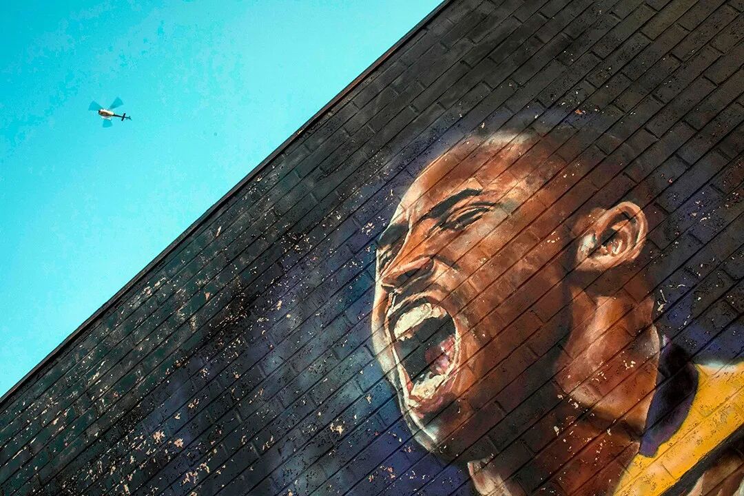 当地时间1月26日,美国洛杉矶,一架直升机经过篮球巨星科比·布莱恩特的壁画。当天,科比和二女儿吉安娜在一起直升机事故中丧生,终年41岁。摄影师:Apu Gomes