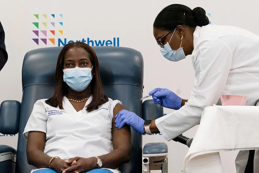 △当地时间12月14日,美国纽约,纽约州当天开始首批新冠疫苗的接种工作,护士桑德拉·林赛(Sandra Lindsay)成为纽约州首名疫苗接种者。摄影师:Mark Lennihan
