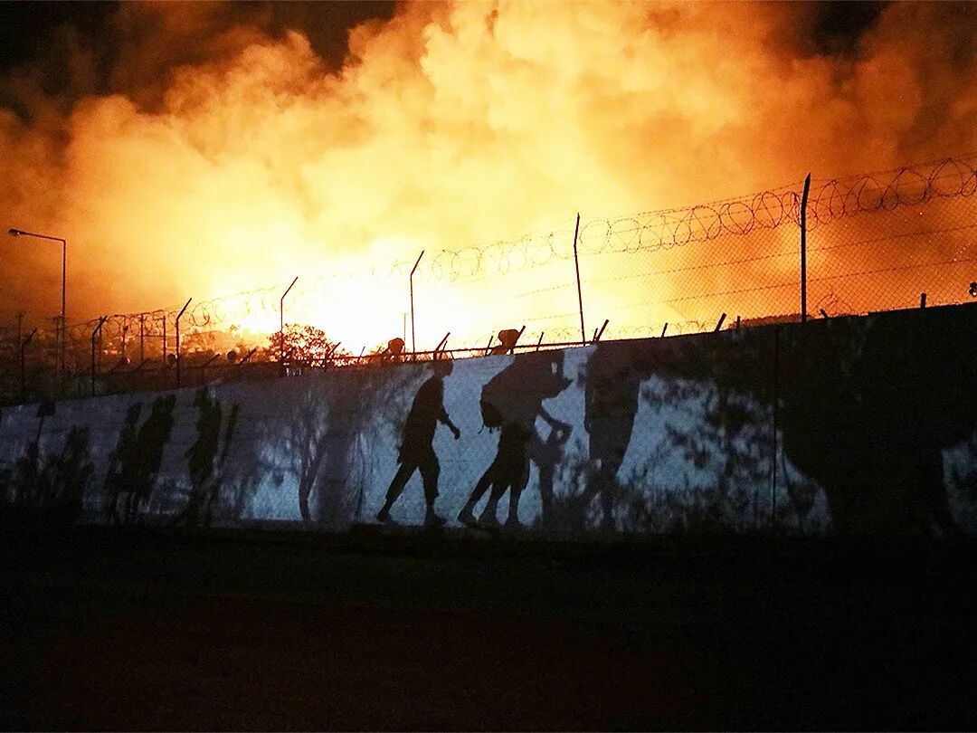 △当地时间9月9日,希腊莱斯博斯岛,莫里亚难民营发生大火,难民带着行李逃离,影子映在墙上。摄影师:Elias Marcou