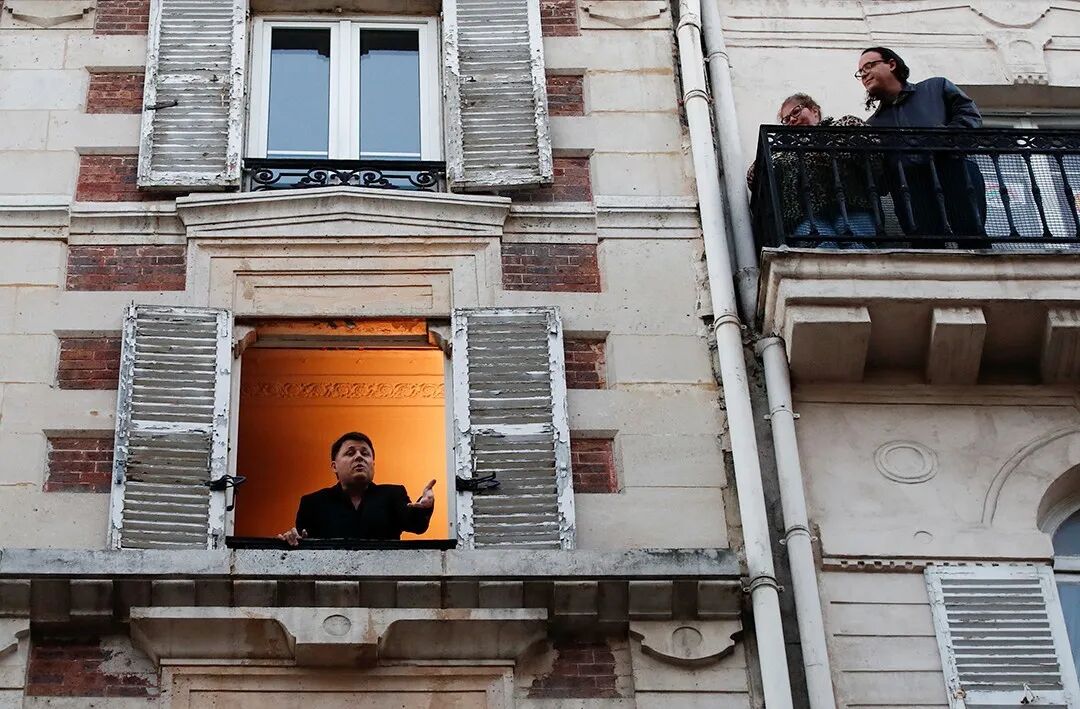 △当地时间3月24日,法国巴黎,疫情蔓延,男高音歌唱家史蒂芬·西尼查(Stephane Senechal)在公寓窗口唱歌,吸引邻居倾听。摄影师:Gonzalo Fuentes