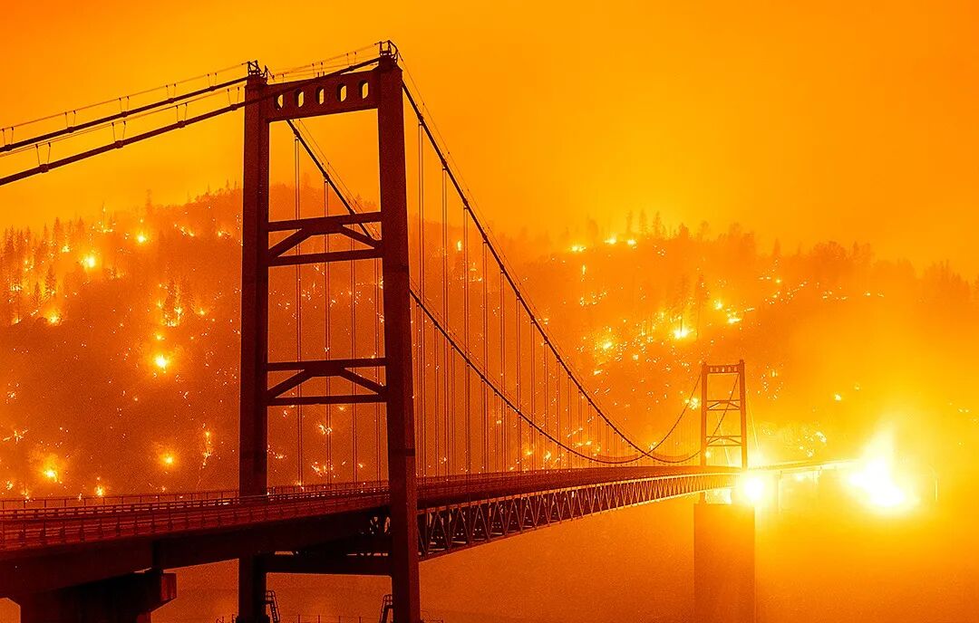 △当地时间9月9日,美国加州山火持续蔓延,比德韦尔巴大桥后方的山坡成火海。摄影师:Noah Berger