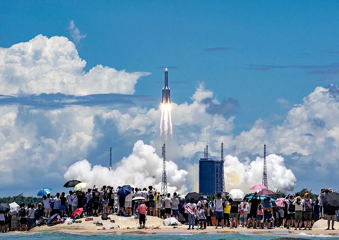 △7月23日,海南文昌,中国首次火星探测任务“天问一号”探测器,由长征五号遥四运载火箭发射升空,人们聚集海滩观看发射瞬间。图片:人民视觉