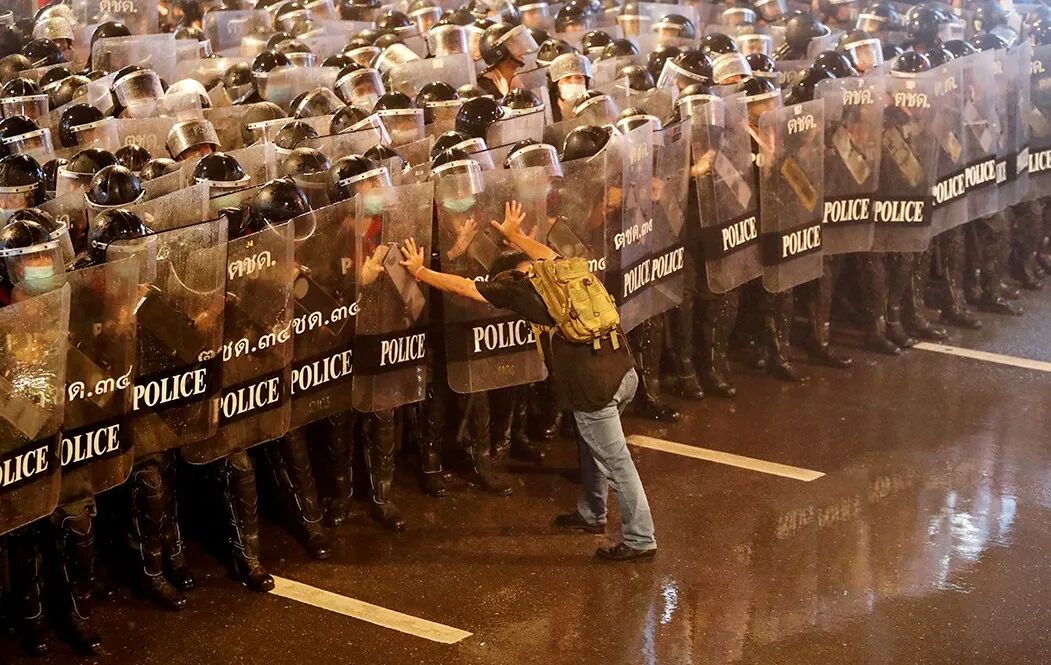△当地时间10月16日,泰国曼谷,一名示威者阻止警方靠近。今年以来,泰国爆发多次反政府游行。摄影师:Jorge Silva