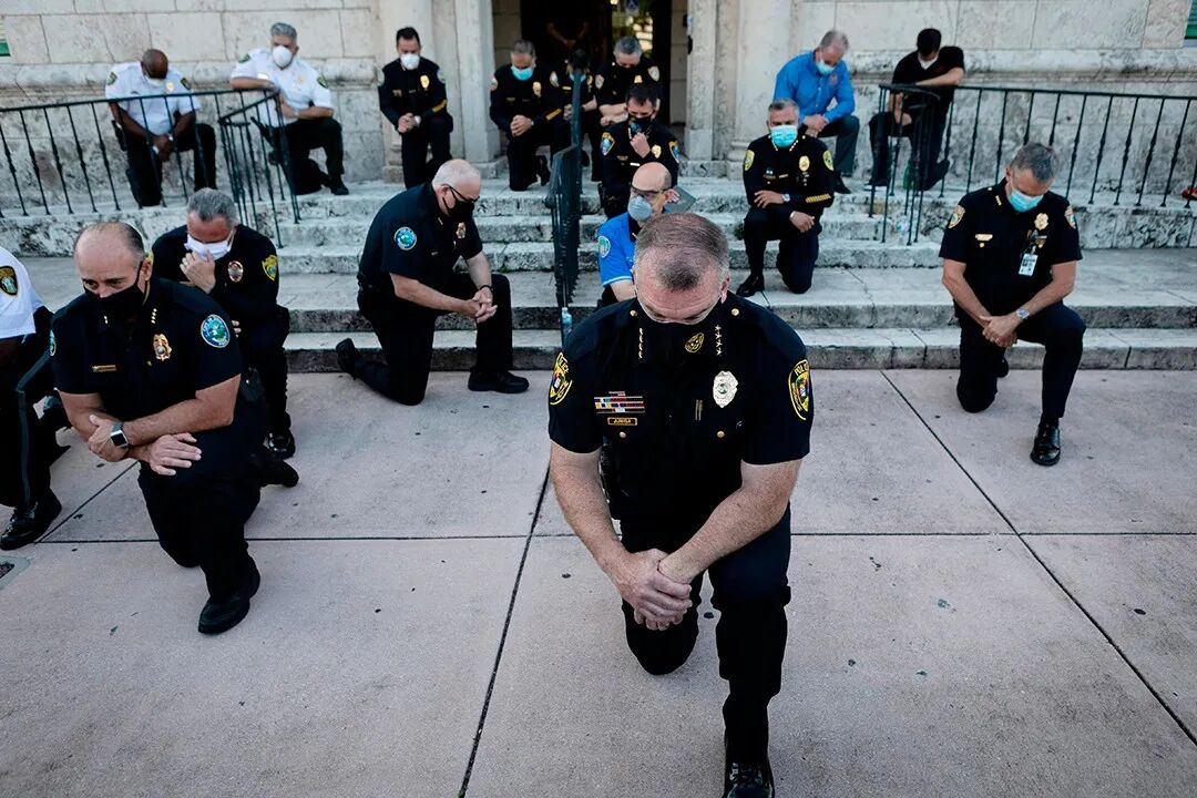 △当地时间5月30日,美国科勒尔盖布尔斯,警察在集会上单膝跪地,以回应弗洛伊德之死事件。摄影师:Eva Marie Uzcategui