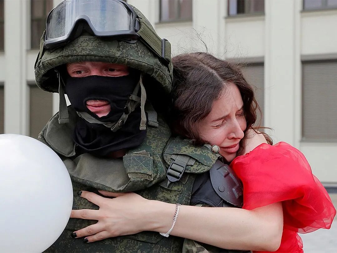 △当地时间8月14日,白俄罗斯明斯克,一名反对总统选举结果的抗议者,拥抱独立广场站岗的军人。摄影师:Vasily Fedosenko
