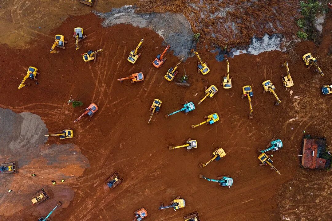 △1月24日,中国武汉,火神山医院施工现场,百余台挖掘机同时作业。新冠疫情严峻,当地参照“ SARS” 时期北京小汤山医院模式,新建火神山医院集中收治患者。火神山医院从方案设计到建成交付,仅用了10天。图片:人民视觉