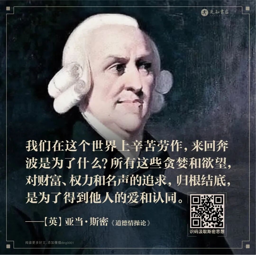 “被他人注意、被他人关怀,得到他人的同情、赞美和支持,这就是我们想要从一切行为中得到的价值。富有的人忘情于财富,是因为财富能够自然而然地为他吸引世界的目光。穷人则完全相反,他们以贫穷为耻。他们感觉到自己生活在世界的目光之外。一旦感到自己被世界所忽略,人类天性中最强烈的欲望将必然难以得到满足。穷人进出家门都不为人所注意,即使在闹市,他也会像独处在家一样默默无闻。而名流显贵们则不然,他们一直为世界所瞩目。所有的人都渴望能够一睹尊颜。他们的行为成为公众关心的对象。他们的片言只语、举手投足都不会被人忽略。”