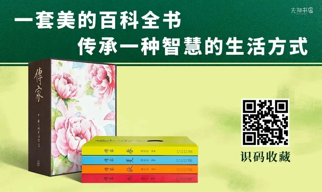 全书分春、夏、秋、冬四卷,每一卷都包含“气氛生活”“岁时节庆”“以食为天”“匠心手艺”“齐家心语”“生活札记”六个主题。◎ 它讲中国传统之博:从八段锦、十大名曲、二十种味觉、二十四种发饰、四十二式太极拳,到书信遣词、称谓用语、传统服饰的设计图样……中国人祖辈们,以及祖辈的祖辈们的“生活艺术”都在这里。◎ 它讲中国传统之美:“很遗憾现代人无法领略中国传统器物的线条之美。”作者用设计师的工笔,勾勒出每种器物、服饰、工艺的细节,让“我们精致的生活不仅留存于博物馆”。◎ 它讲匠心之诚:书中令人目不暇接的摄影、手绘、图表,作者全部亲力亲为:研究鸡蛋就抱几只鸡来养,写蔬菜就亲自去种,没有豆腐乳工厂接受拍摄,就亲自接种毛霉菌……这套书从写作到出版,历时9年,引得无数媒体盛赞。简体版由著名出版人张立宪引进内地,品质不降反增:除了保留台版全部内容之外,还进行诸多增订。选纸方面,更加讲究,选用更有质感、也更昂贵的彩印纯质纸。白先勇说:这是一套“美的百科全书”,龙应台说:这套书,有两个实相:表面那一层是衣食住行育乐、春夏秋冬五行;里头那一层,其实是生活的态度,是文化的承载,是时代最深刻、最鲜活、最摸得着、闻得到的声音、气息和面貌。长按下图,识别图中的二维码,即可购买收藏《传家:中国人的生活智慧》。