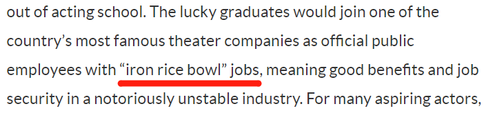 tap into sth. /tæp ˈɪntə/ 则是固定搭配,表示开发、发掘,利用,使用…以获得好结果,to manage to use something in a way that brings good results。比如说:如果我们能够挖掘出我们的创意,我们就能赢得这次比赛:We will win the contest if we can tap into our creativity.affiliated /əˈfɪlieɪtɪd/ 就表示隶属的、附属的,政府附属机构就是 government-affiliated institutions;浙江大学附属学院就是 a college affiliated to the University of Zhejiang。The lucky graduates would join one of the country's most famous theater companies as official public employees with "iron rice bowl" jobs, meaning good benefits and job security in a notoriously unstable industry.幸运的毕业生将加入这个国家最著名的戏剧公司之一,成为有着“铁饭碗”工作的公职人员,这意味着在一个出了名的不稳定行业中获得良好的福利和工作保障。我们看good benefit 良好福利 和 job security 工作保障 这两个词,可谓是点出了编制的重要优势。