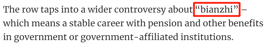 The government job comes with "bianzhi," which usually means protections against dismissal, housing subsidies or other benefits.这份带有“编制”的政府工作,免受解雇、有住房补贴和其他福利。注意这个词 dismissal /dɪsˈmɪsl/,就表示解雇、开除,an act of officially removing an employee from their job。比如,他决定起诉公司非法解雇他:He decided to sue his company for wrongful dismissal.subsidy /ˈsʌbsədi/ 就表示津贴、补贴,住房补贴就是 housing subsidy,出口补贴就是 export subsidy,防暑高温补贴就是 high temperature subsidy。The row taps into a wider controversy about "bianzhi" – which means a stable career with pension and other benefits in government or government-affiliated institutions.这场争议引发了关于“编制”更为广泛的论战,编制是一种稳定职业,在政府或政府附属机构中拥有养老金和其他福利。row /rəʊ/ 在这里不是我们熟悉的一排、一行,而是表示争吵、争论,a noisy argument or fight。比如说,我父母经常吵架,但大部分时间都是我爸在那儿扯着嗓子嚷嚷:My parents often have rows, but my dad does most of the shouting.