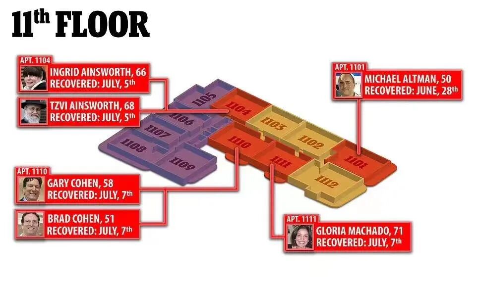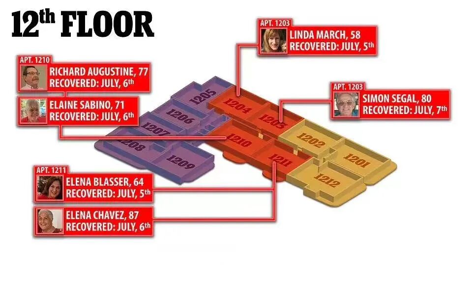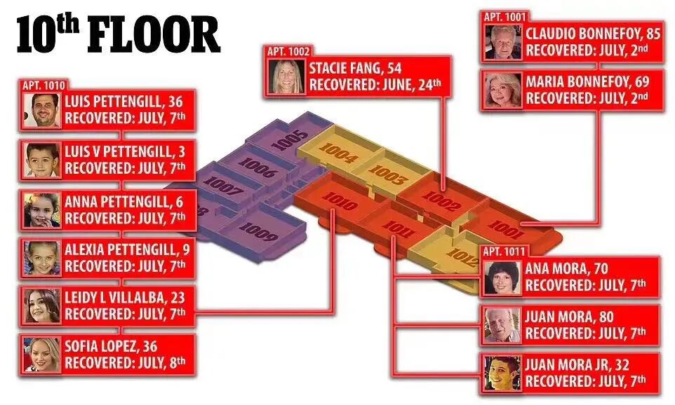 迈阿密的这栋大楼倒塌后,官方确认的98个遇难者的年龄分布在1岁至92岁间。官方还公布了每个遇难者的名字,和他们所居住的楼层、房间号等详细信息。在该楼最高三层:10、11、12层的遇难者(以下略)。