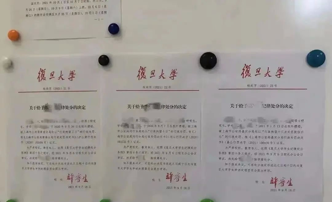 而校方依照《复旦大学学生纪律处分条例》第四十条规定,经2021年9月6日校长办公会议审议,决定给予上述三名学生开除学籍处分。