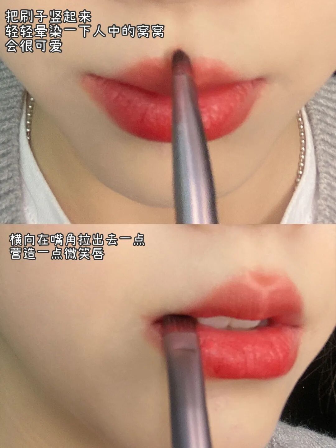 先天嘴唇偏薄的鲶鱼系姐妹,可以在唇峰上方画一个M,慢慢晕染,下唇可以稍稍涂出去一圈,加深下唇中间。
