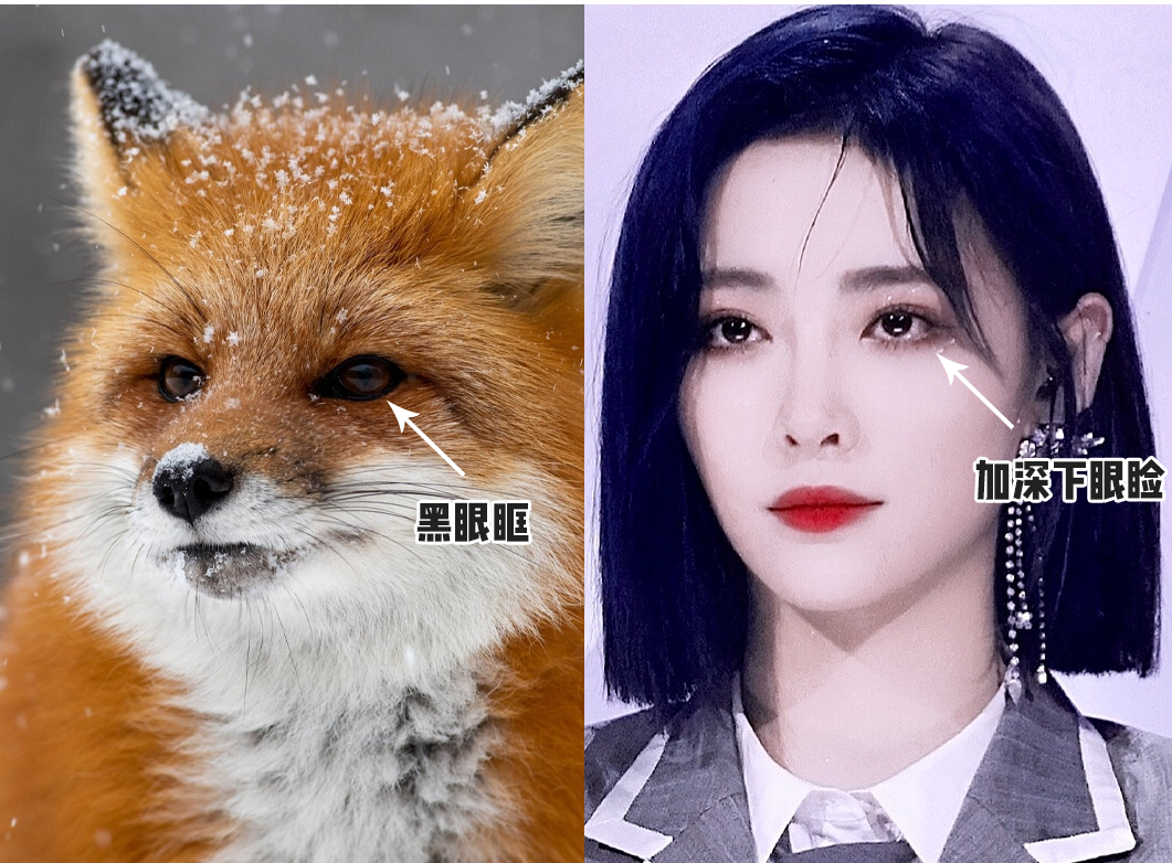 可以发现狐狸外一圈是黑黑的,那狐系长相就不妨试试加深下眼睑,来增加妩媚深邃气质。