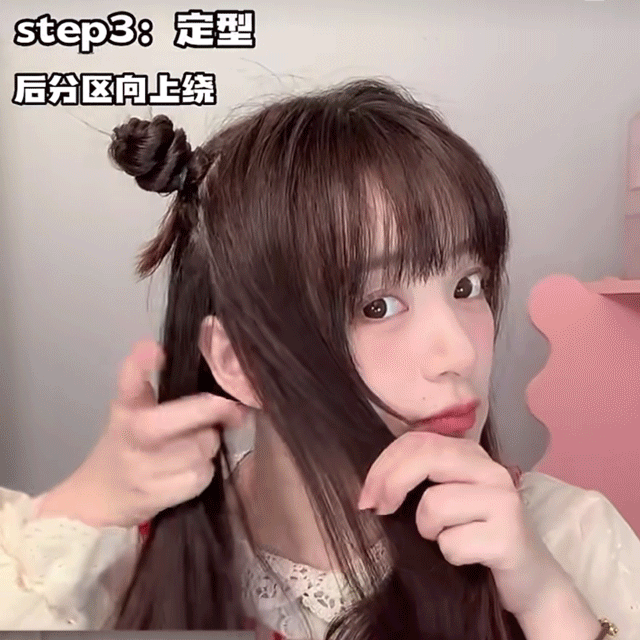 Step2:先扎两个小揪揪在头顶,再把头发挖个洞往里翻(记得拉的好看饱满一些)