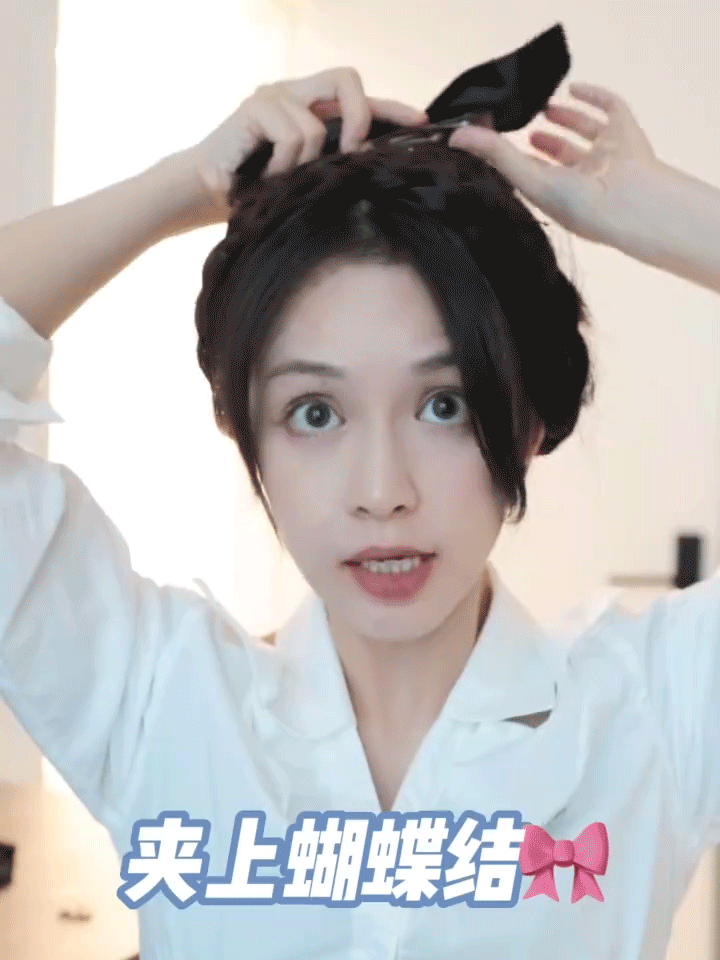 Step3:最后把两撮头发叠在一起夹上蝴蝶结(另一边也是同样操作),一个甜美的半扎公主头就完成喇👇