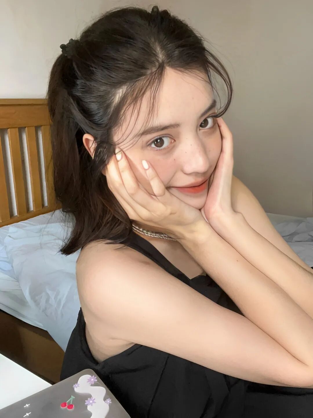 Step3:最后把发尾收进去(另一边同理),再别上蝴蝶结,一个kiki同款的元气减龄泡泡辫就完成喇。