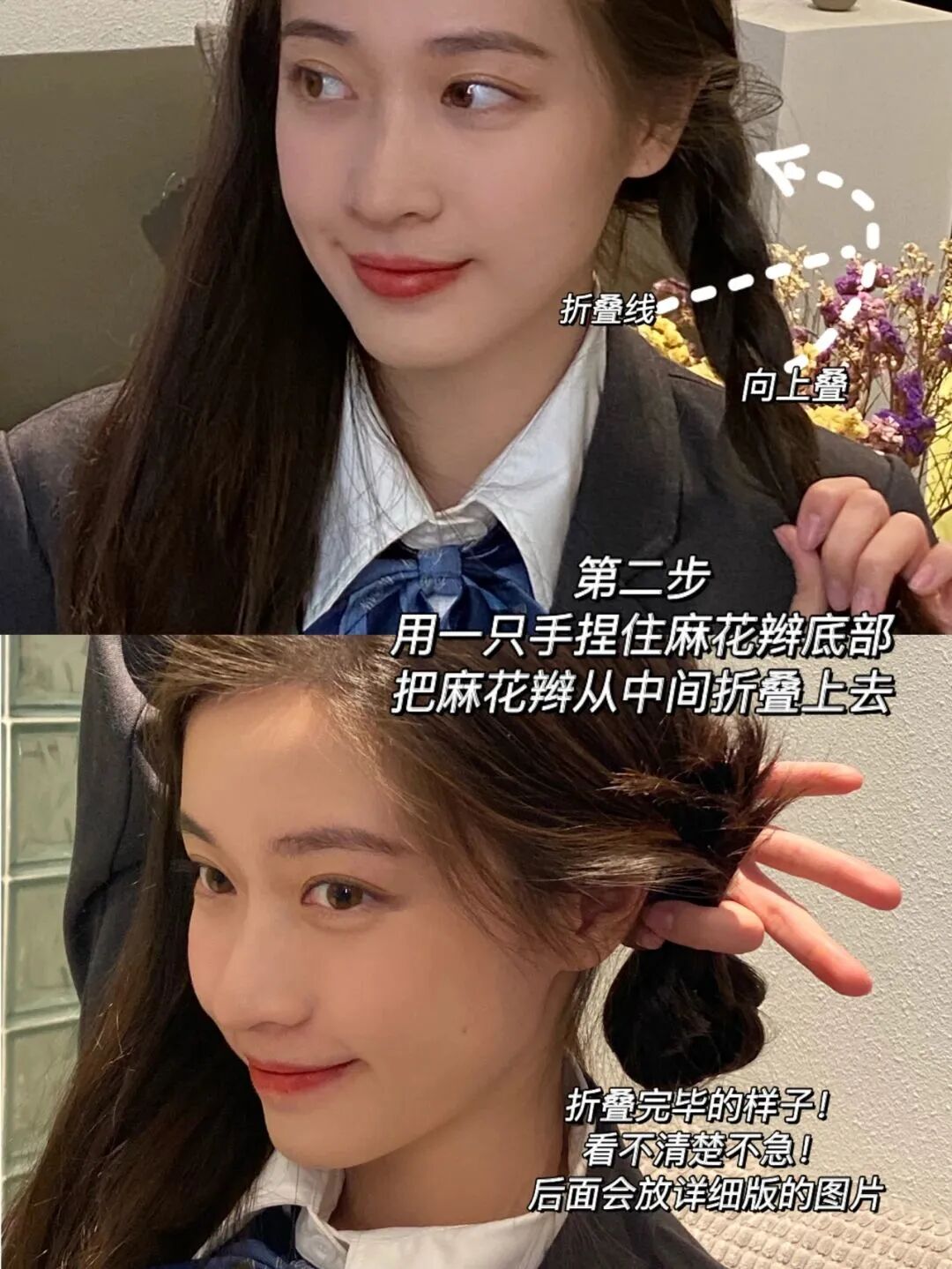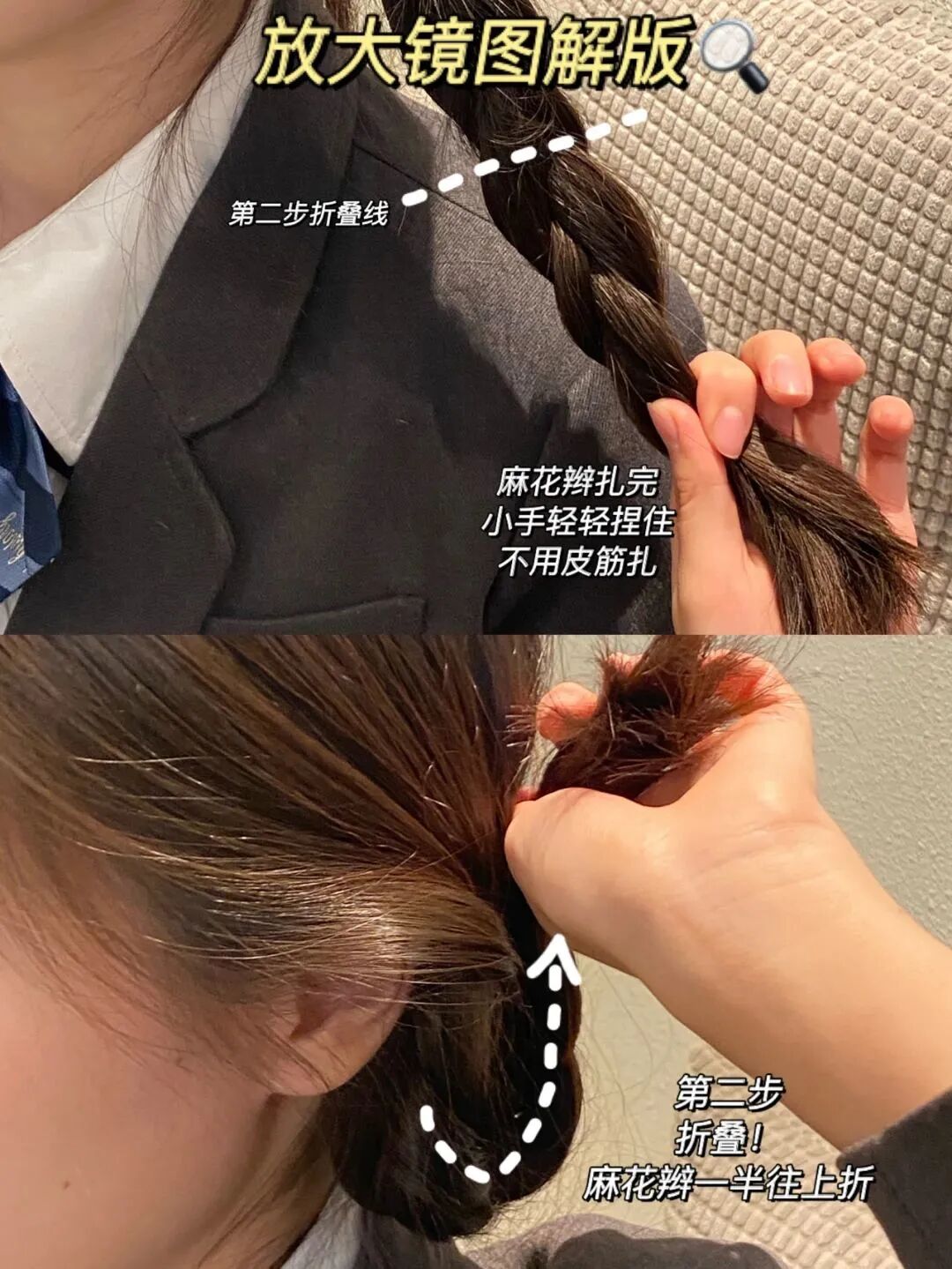Step2:一手捏住麻花辫底部,从中间部分向上折叠