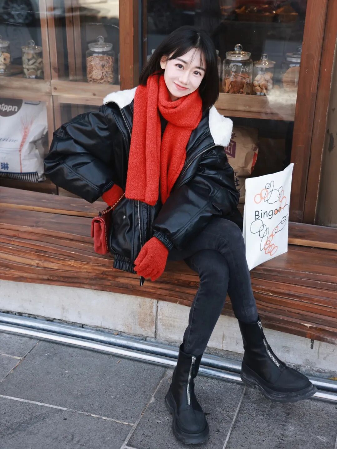 觉得白色不耐脏的姐妹,可以选择红色围巾,正好接下来的节日跟红色围巾都很搭~