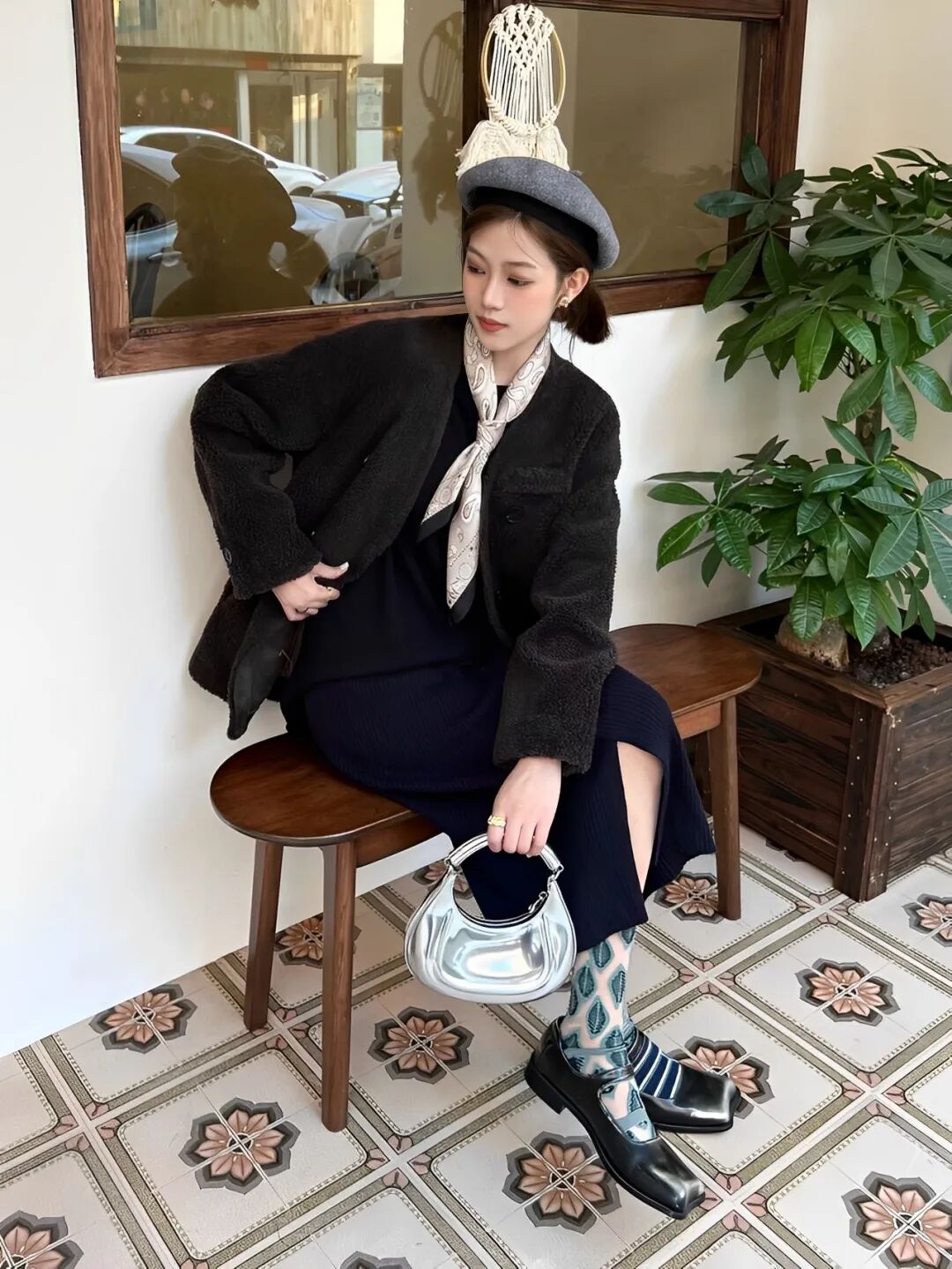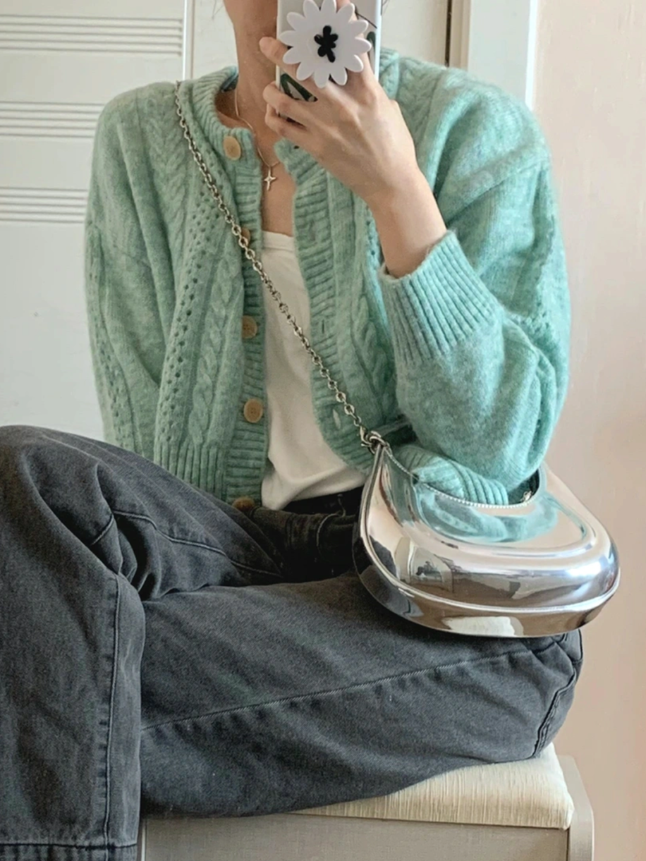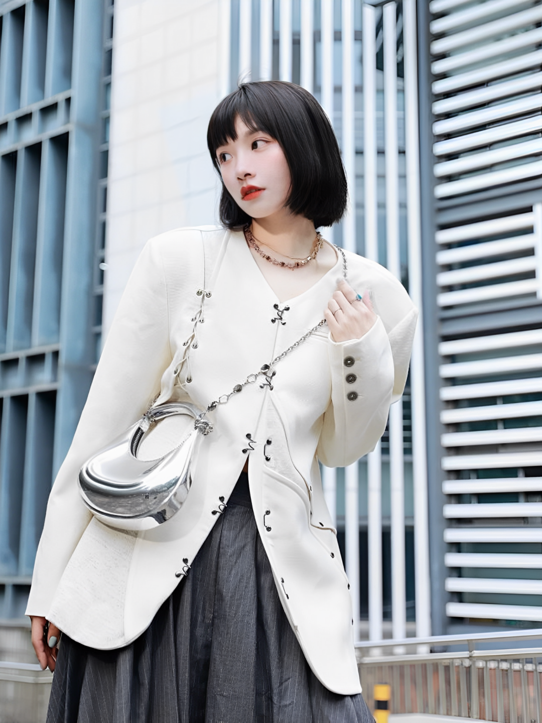 这个银色包包款式是伊娃包那类,小众款又很吸睛,会给人一种“品味真好”的feel~包型也比较小巧,对于咱们哈比人来说刚刚好不压个子,拍照超出片。