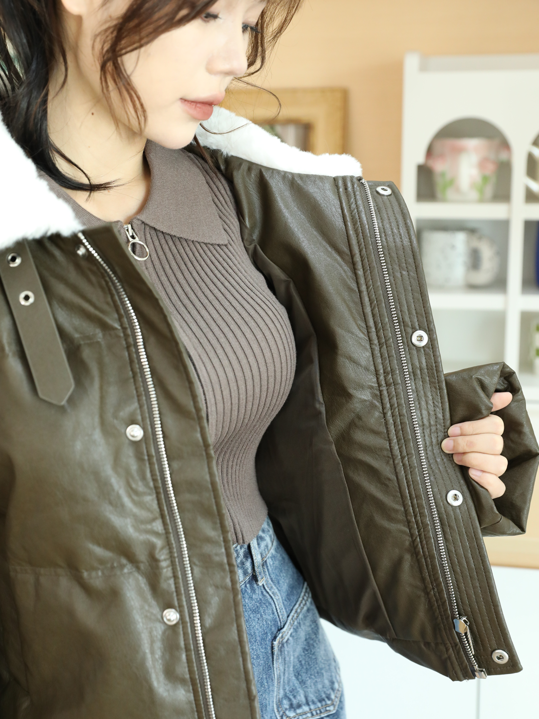 羽绒材质是皮面的,穿上一点都不臃肿。翻领的细节感hin足,@小沉是翻领敞开式穿法修饰头肩比,把领子立起来就是酷妹感拉满!