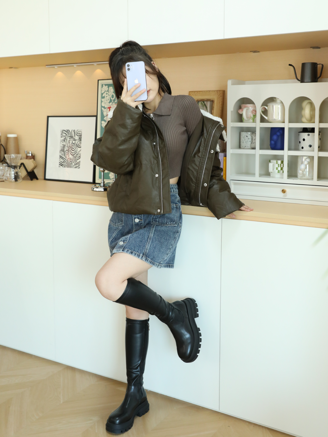 look1:这个秋冬我一直想尝试下酷妹穿搭,刚好就被我逛到这一套了!机车感毛绒翻领羽绒服+短牛仔裙,加上棕色露腰短上衣,保暖时髦两手抓。
